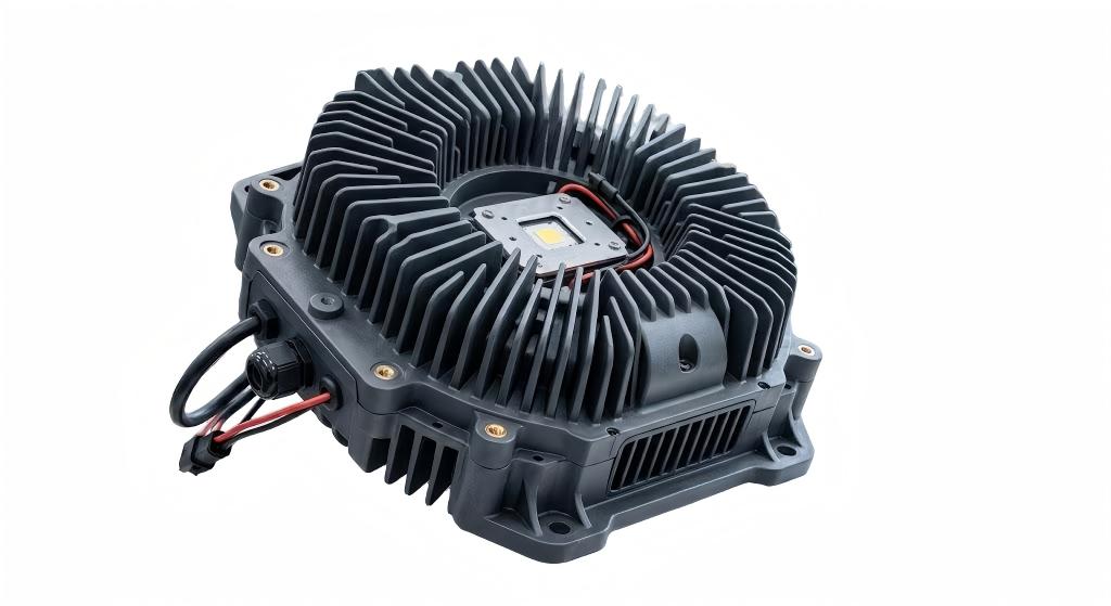 - 集成组件外壳:与标准散热器不同,该装置具有专为IP68 电缆密封套集成设计的专用侧端口和用于驱动器接线的内部空腔。这简化了防水灯具的组装。